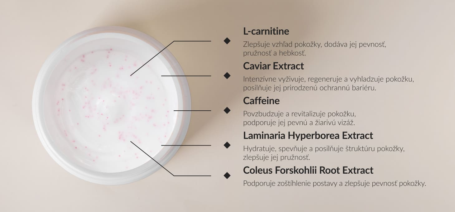Zloženie balzamu je obohatené o vysoko účinné zložky, ktoré podporujú hydratáciu, spevnenie a výživu pokožky. L-karnitín zlepšuje pevnosť a hladkosť pokožky, kofeín revitalizuje a podporuje pevnosť, zatiaľ čo výťažok z kaviáru intenzívne vyživuje a vyhladzuje epidermis. Výťažok z riasy Laminaria Hyperborea hydratuje, posilňuje a spevňuje pokožku, zatiaľ čo výťažok z koreňa indickej žihľavy pomáha formovať telo a dodáva pokožke pevný a zdravý vzhľad.