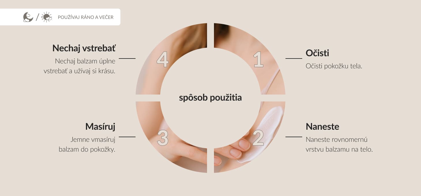 Naneste balzam na vyčistenú pleť a jemne vmasírujte. Nechajte pôsobiť, kým sa úplne nevstrebe. Výrobok nie je potrebné oplachovať.