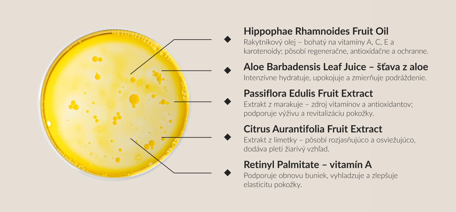 Zloženie (INCI): Aqua, Propylene Glycol, Isohexadecane, Caprylic/Capric Triglyceride, Dimethicone, Phenoxyethanol, Parfum, Hippophae Rhamnoides Fruit Oil, Aloe Barbadensis Leaf Juice, Passiflora Edulis Fruit Extract, Retinyl Palmitate, Citrus Aurantifolia Fruit Extract, Tocopheryl Acetate, Panthenol, Tocopherol, Hydrolyzed Oats, Glycerin, Ethylhexylglycerin, Sodium Benzoate, Potassium Sorbate, Tetramethyl Acetyl Acetyl Acetonaphthalenes.