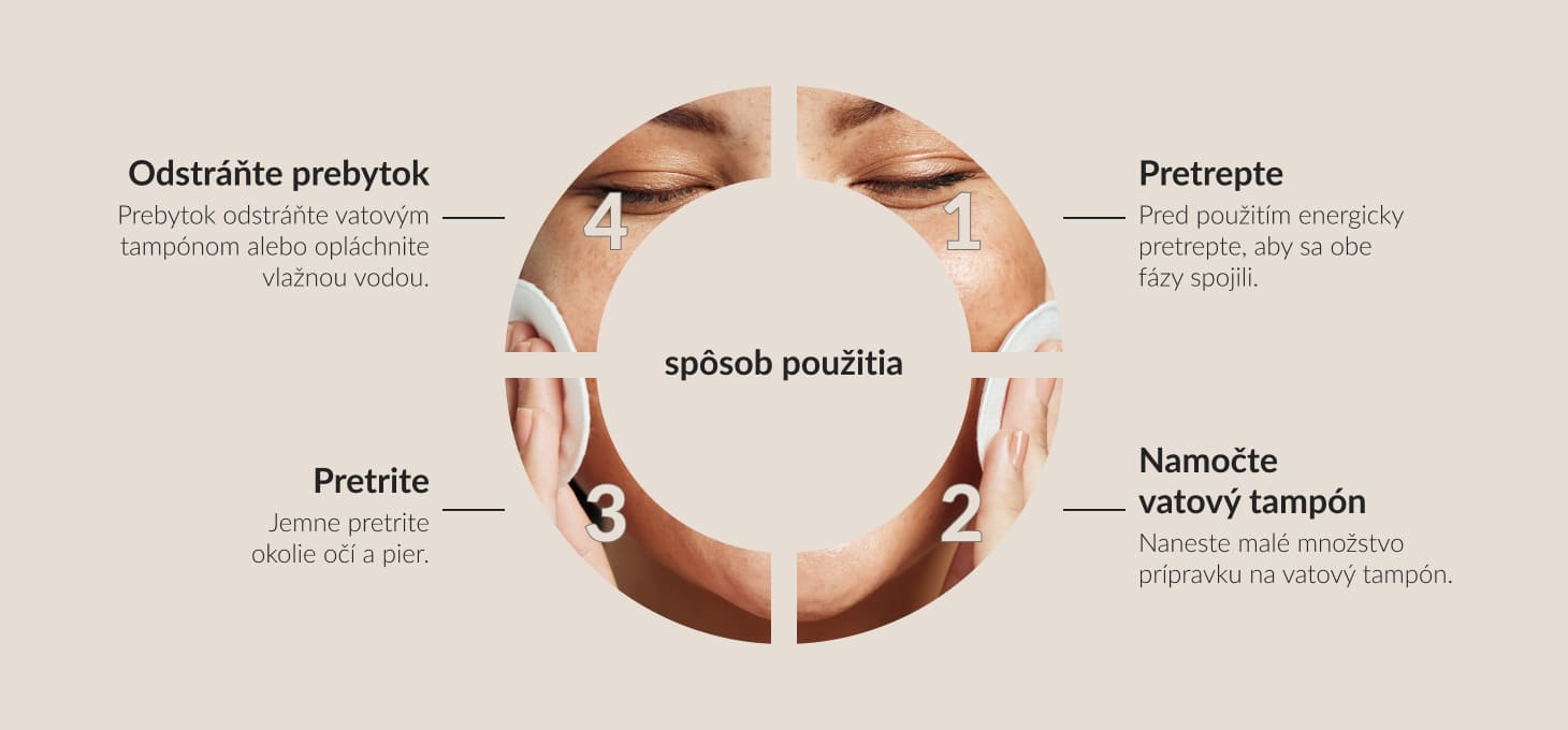 Pred použitím intenzívne pretrepte, aby sa obe fázy spojili. Naneste malé množstvo na vatový tampón a jemne pretrite okolie očí a pier. Nie je potrebné oplachovanie.