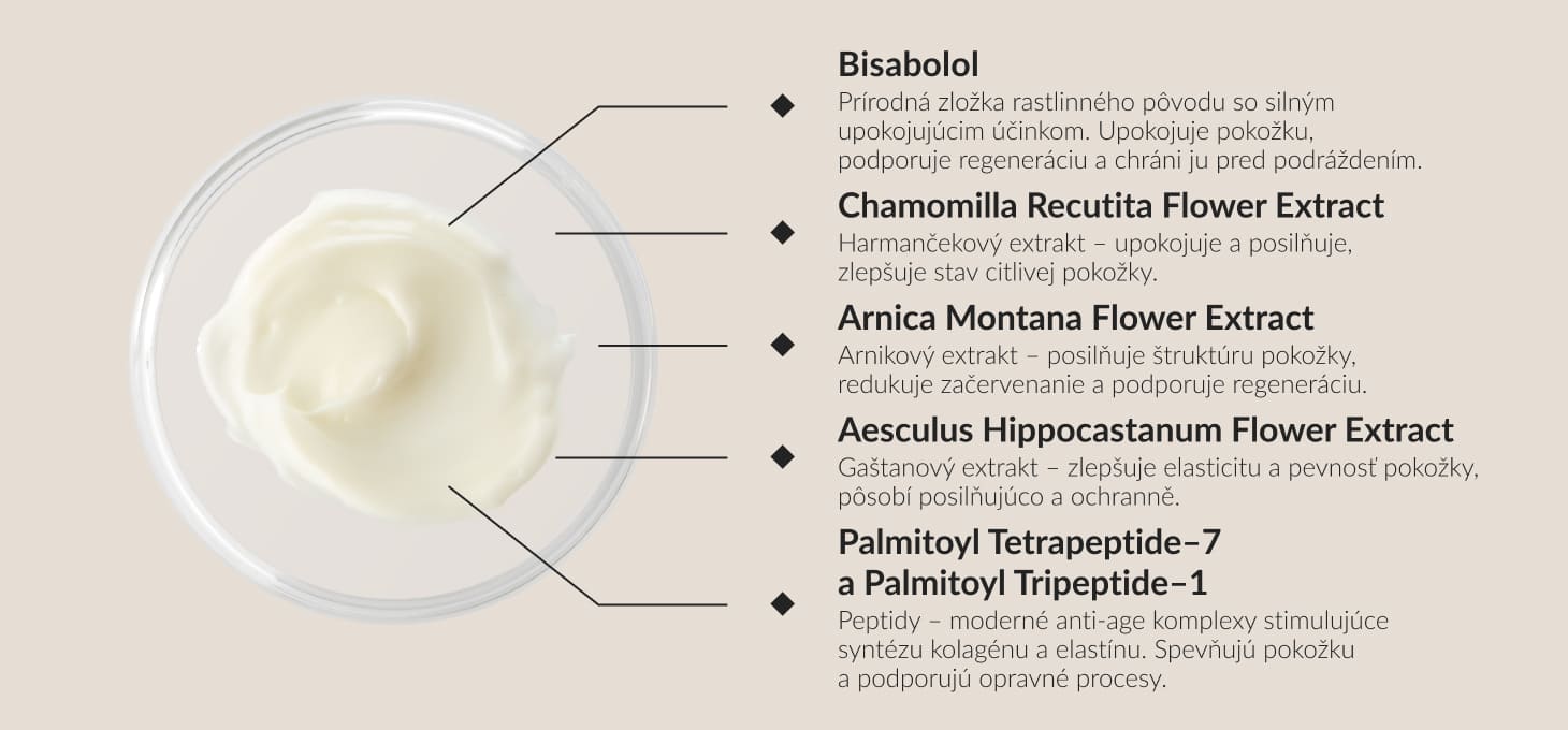 Posilňuje štruktúru pokožky, znižuje začervenanie a podporuje regeneráciu.
