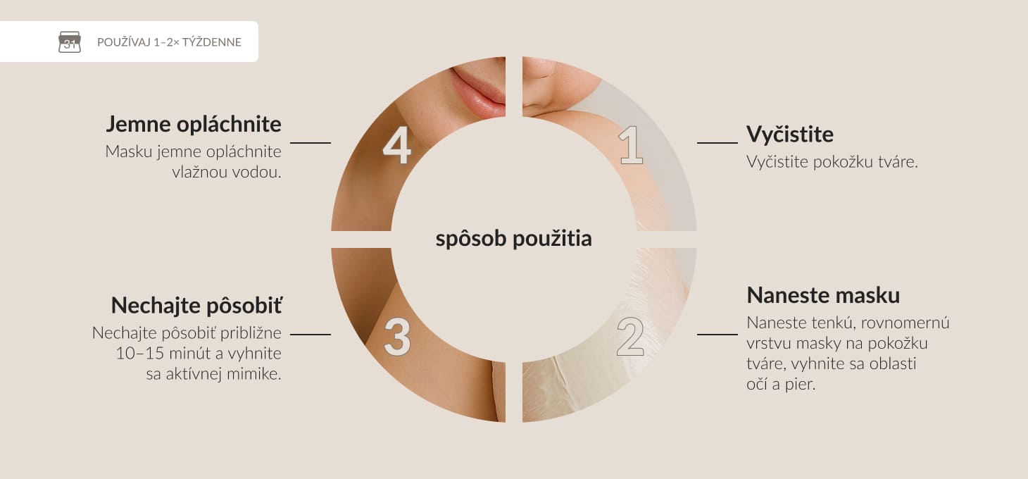 Nechajte pôsobiť 10-15 minút a potom zmyte vlažnou vodou. Používajte 1-2 krát týždenne alebo podľa individuálnych potrieb pleti.