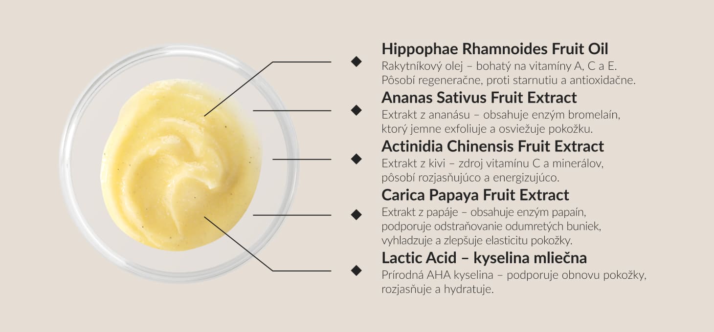 Obsahuje enzým bromelaín, ktorý jemne exfoliuje a osviežuje pokožku.