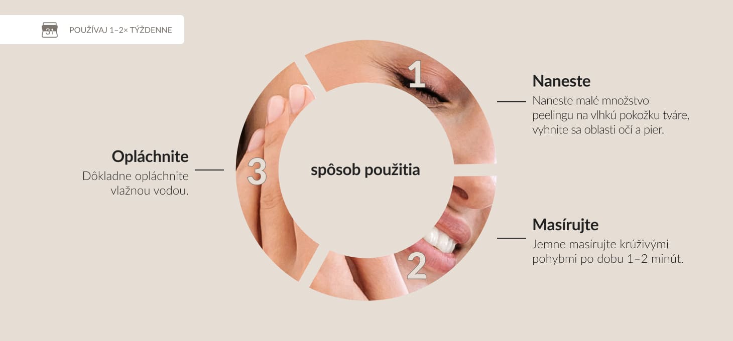 Naneste malé množstvo peelingu na vlhkú tvár, vyhnite sa oblasti očí a pier. 1-2 minúty jemne masírujte krúživými pohybmi, potom dôkladne opláchnite vlažnou vodou. Používajte 1 - 2-krát týždenne alebo podľa individuálnych potrieb pleti.