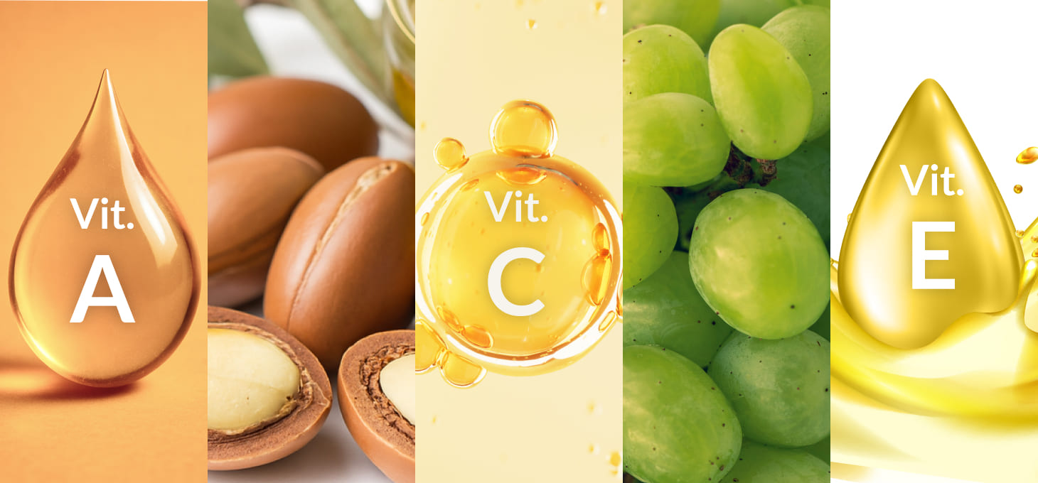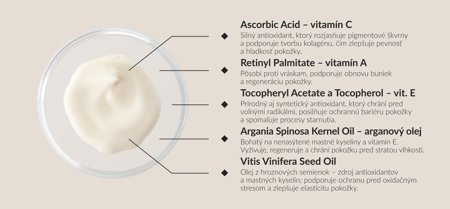 Prírodný a syntetický antioxidant, chráni pred voľnými radikálmi, posilňuje kožnú bariéru a spomaľuje proces starnutia.