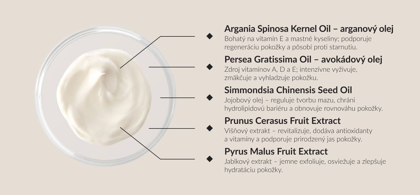 Kombinácia arganového, avokádového a jojobového oleja intenzívne hydratuje, spevňuje a chráni pokožku pred stratou vlhkosti. Vitamíny C a E v zložení majú antioxidačný účinok, podporujú prirodzené procesy obnovy pokožky a chránia ju pred voľnými radikálmi.