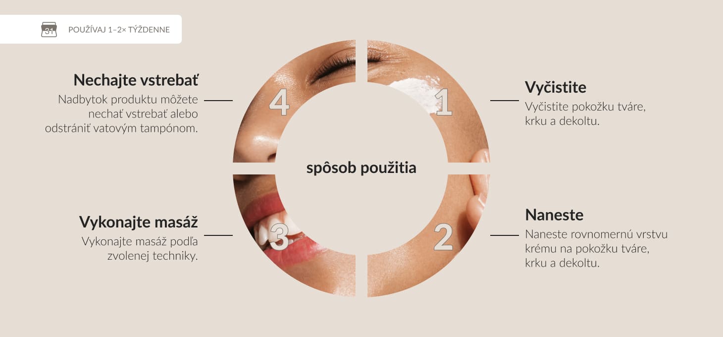 Krém naneste na vyčistenú pleť tváre, krku a dekoltu. Vmasírujte podľa zvolenej techniky. Prebytočný prípravok môžete nechať vstrebať alebo odstrániť vatovým tampónom.