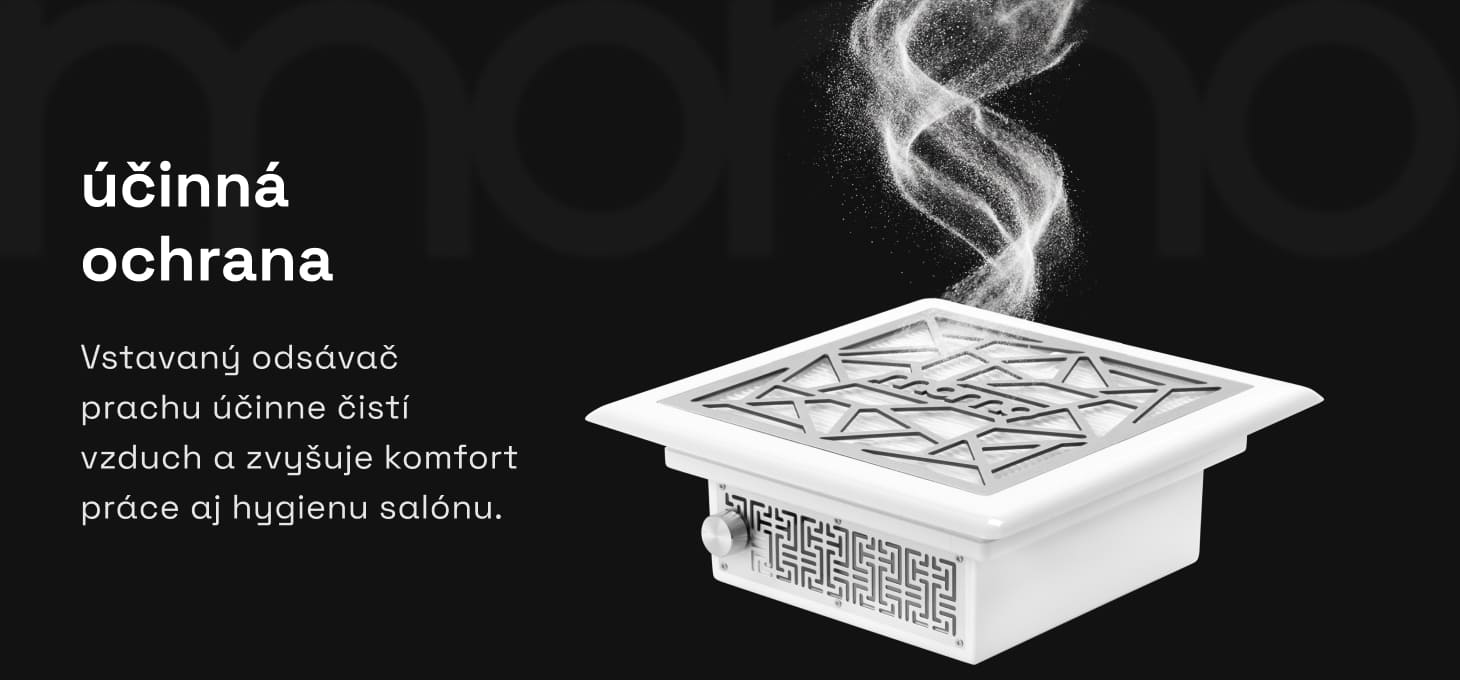 Počas ošetrení vykonávaných frézou sa do ovzdušia uvoľňuje veľké množstvo prachu. V takýchto podmienkach sa výkonný odsávač stáva prvkom vybavenia, ktorý výrazne zlepšuje kvalitu a komfort práce tým, že zabezpečuje účinné čistenie vzduchu. Zvyšuje hygienický štandard salónu, zvyšuje komfort stylistu a poskytuje bezpečnejšie prostredie pre zákazníkov, najmä pri vykonávaní veľkého počtu služieb.